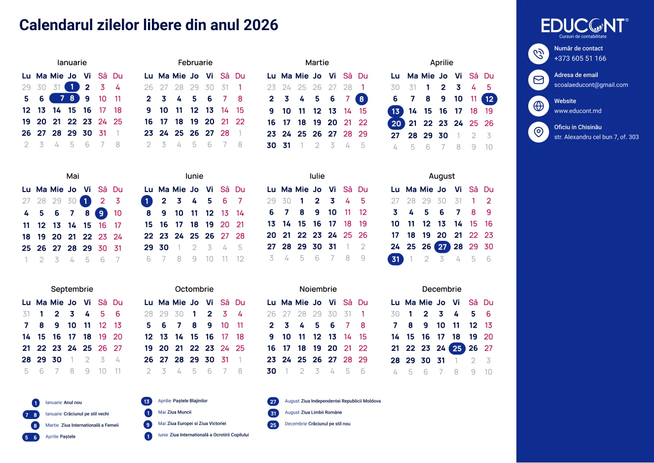 Pentru a vă ajuta să planificati mai usor, am pregătit un calendar practic cu toate informatiile importante, pe care îl puteti salva electronic sau imprima.